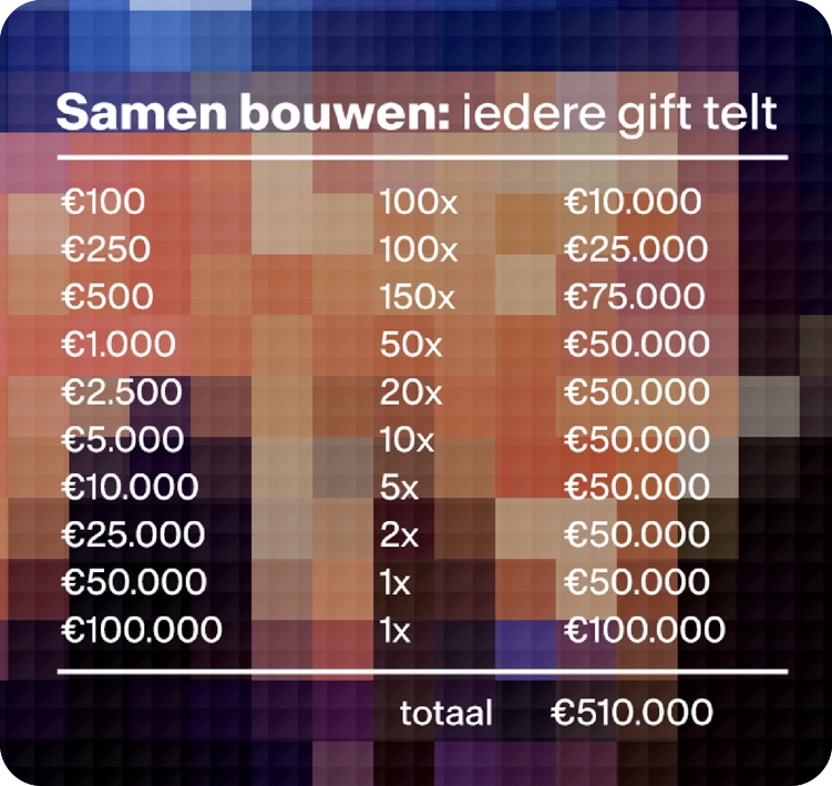 Door jouw vrijgevigheid draag je bij aan het bouwen van de kerk en help je mee om, door de kerk heen, duizenden mensen in Nederland en daarbuiten te bereiken met het evangelie van hoop, transformatie en bevrijding.